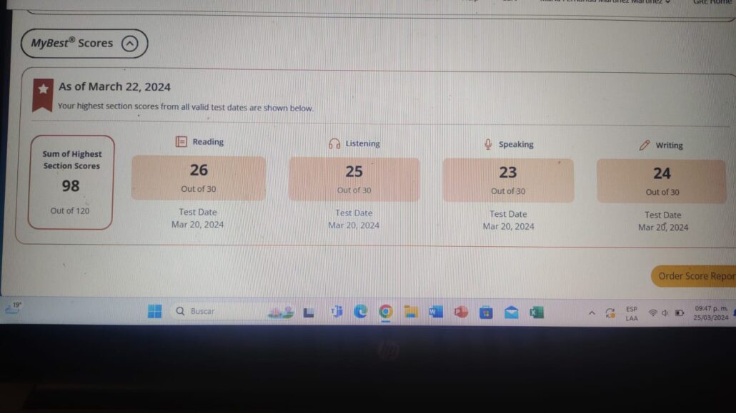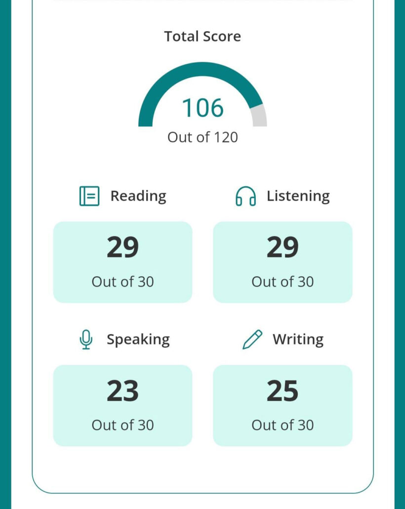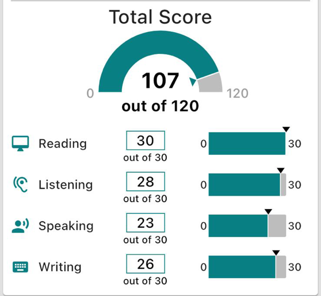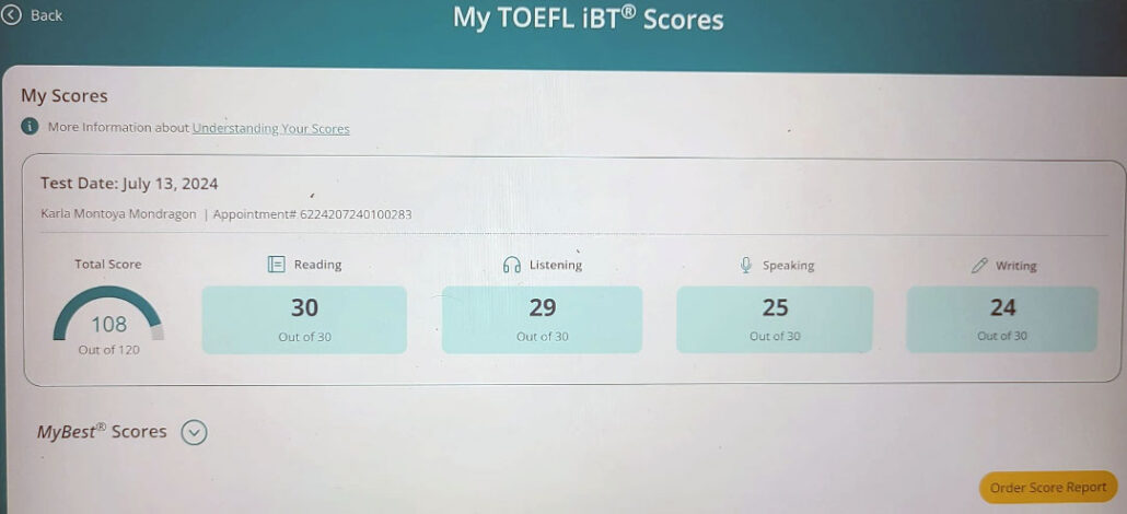 “I’m sending you this email because I wanted to share with you my scores from the TOEFL iBT test, Total: 105. I attended the Verano Puma course a few weeks ago and I wanted to tell you that it was super helpful and of course, I wanted to thank you.”